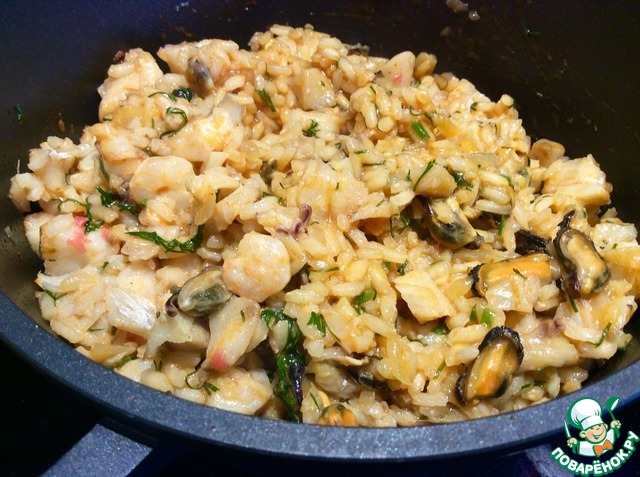 К рису добавить зелень, сыр, перемешать, добавить морепродукты, прогреть около 5 мин, сразу подавать.