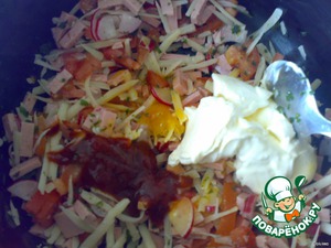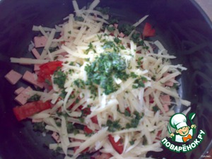 добавить тертый сыр, зелень, сырое яйцо, сметану и кетчуп -