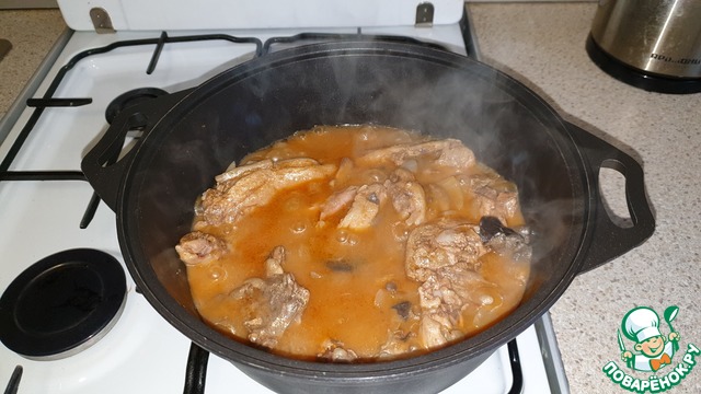 Добавляем ее к уже поджаренной и выпустившей жир уточке и тушим еще минут 40 на маленьком огне под крышкой, периодически помешивая (так как мука в заправке способствует подгоранию :-))