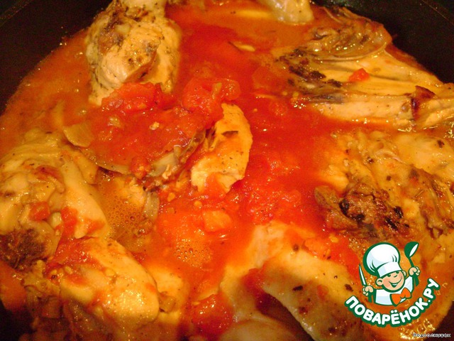 Добавить нарезанные томаты вместе с соком и 1 ст. куриного бульона. Посолить, поперчить и тушить под крышкой 20-25 мин. -