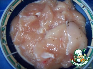 Куриное филе нарезать на тонкие кусочки, посолить, поперчить,