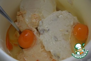 В другую емкость кладем 3 пачки творожной массы (тут по желанию - можно под собственный вкус производить манипуляции с видами творожных масс :)). В данном случае - это обычная творожная масса, с изюмом и еще одна с курагой.