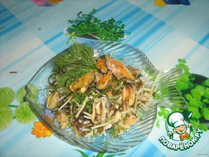 Выкладываем в салатницу и украшаем мидиями и зеленью.