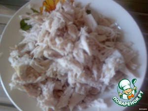 Куриную грудку сварить в соленой воде и разорвать на волокна, поперчить, добавить мускатный орех