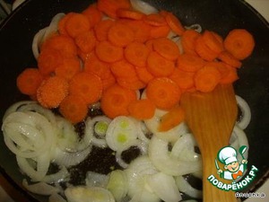Рис смешать с обжаренными луком, морковкой и кальмарами.