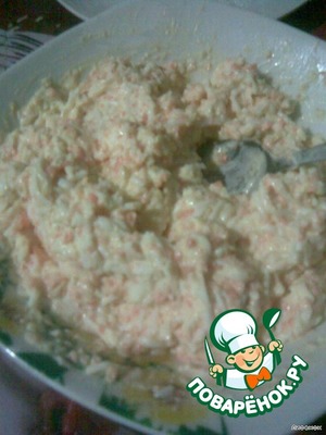 Приготовим начинку. Яйца, сыр, морковку натрем на мелкой теркe, выдавим чеснок, посолить и заправить майонезом.