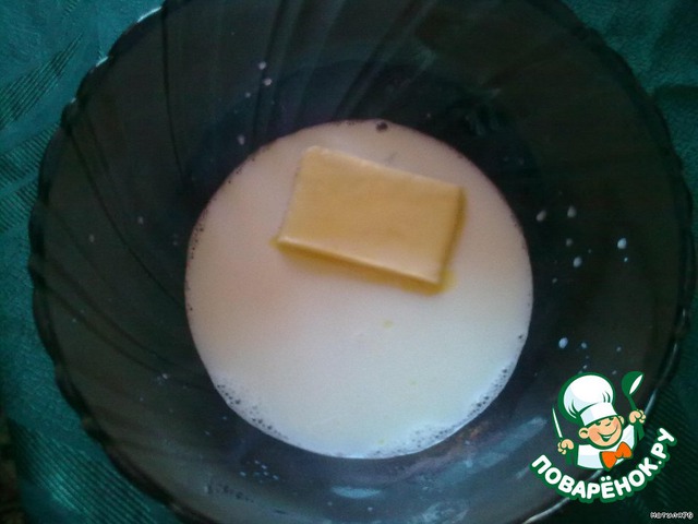 В миску кладем половину пачки масла, добавляем соль и заливаем горячим молоком