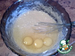 В молоко добавляем дрожжевую смесь, 2 стакана муки и яйца. Взбиваем все в однородную массу
