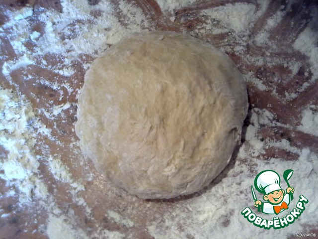 Постепенно высыпаем остальную муку и замешиваем тесто. Переносим на присыпанную мукой поверхность и продолжаем вымешивать. Затем формируем шар