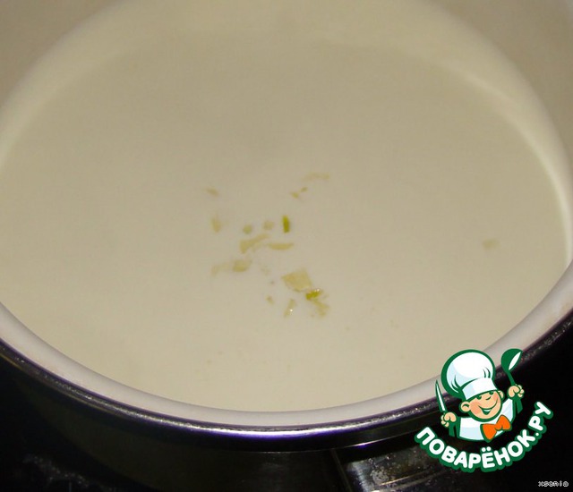 Чеснок мелко порежем, добавляем в сливки. Сливки доводим до кипения. Убираем с огня