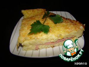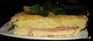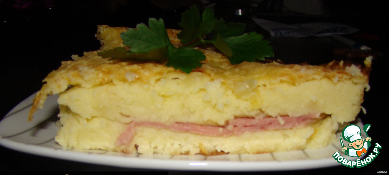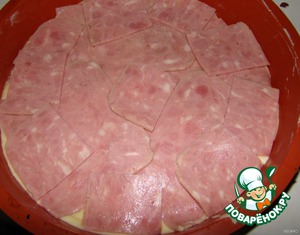 Возьмите форму с высокими бортами.. Выкладывем часть пюре. Затем пластики ветчины