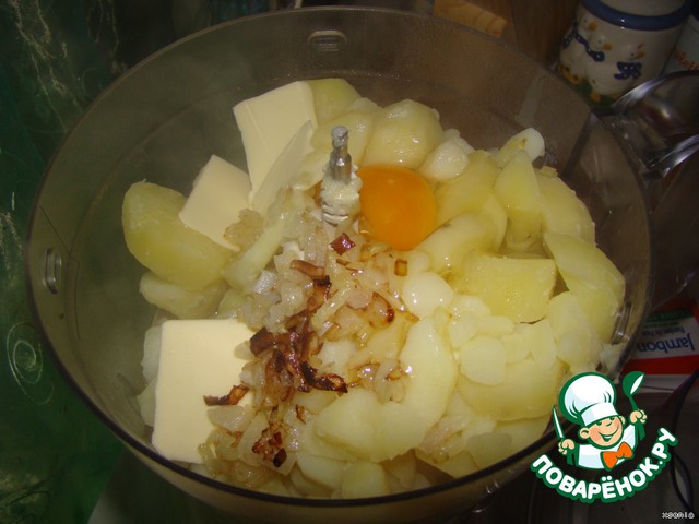 Смешиваем готовый картофель. Яйца. Масло сливочное. Сливки и обжаренный лук.