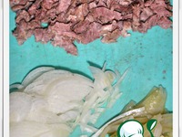 Заранее отварить мясо, нарезать на тонкие полоски огурцы соленые (очистить от кожицы), нашинковать лук |