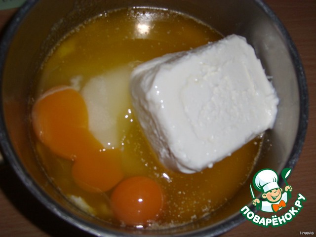 ... добавить яйца + творог (творог может быть любым, если он крупинчатый, то тесто будет иметь более насыщенный творожный вкус)+ оставшийся шар + ванилин...