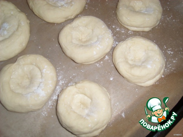 ... далее смачиваем водой нашу лепёшку и выкладываем сверху колбаску - получается нечто вроде гнёздышек. Даём ещё раз подойти.