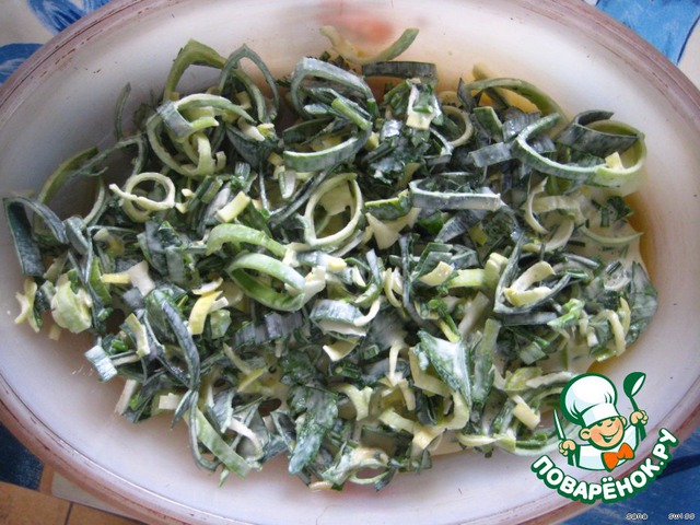 В салатнице перемешать лук-порей со сливками, горчицей и 1/2 части зелени.