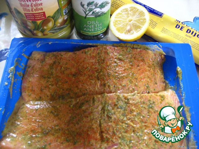 Из оливкового масла, горчицы, лимонного сока и специй сделать маринад и замариновать семгу со всех сторон.