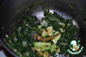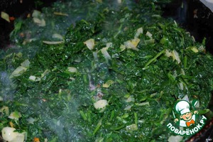 Добавляем нарезанный шпинат и тушим на небольшом огне 5 минут. Помешиваем. -