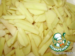 Очищенный от кожуры картофель нарезать небольшой соломкой.