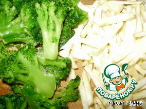 Очищенный корневой сельдерей нарезать соломкой, а брокколи разобрать на небольшие соцветия.