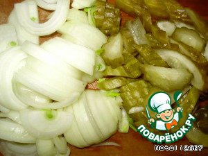 Репчатый лук и маринованные огурцы нарезать полукольцами.