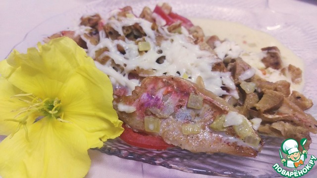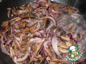 Пока мариновалась рыба, обжариваем на растительном масле грибы с луком (соль, специи - по вкусу).