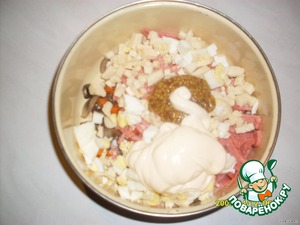 Добавляем горчицу (из цельных зерен) и майонез. Перемешиваем.