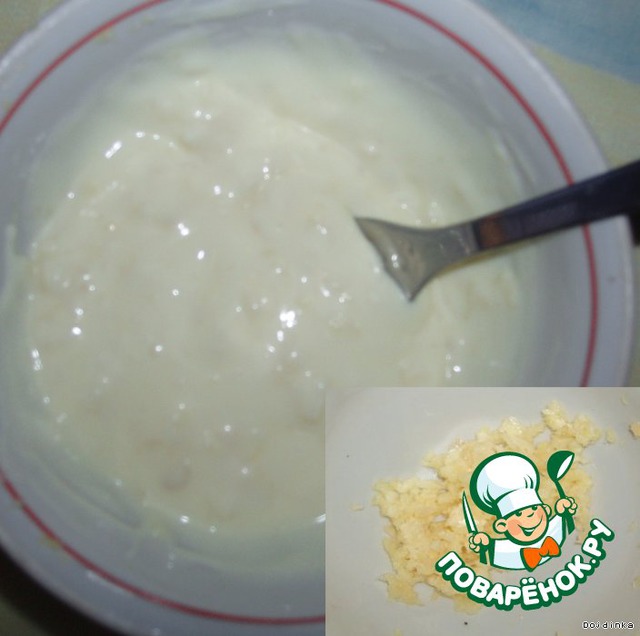 Выдавливаем чеснок через чеснокодавилку и смешиваем его с майонезом (также можно добавить немного тертого сыра).