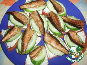 Затем кладем огурчик, а уже на огурчик кладем шпротину.