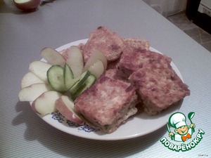 Нарезать на кусочки, как вам угодно. У меня приблизительно 5x5 см. Обмакнуть в готовую смесь: