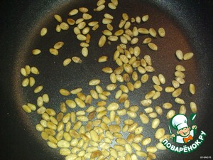 Слегка обжарить на сухой сковороде кедровые орешки