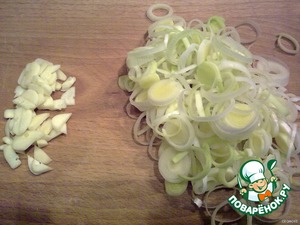 Нарезать тонкими кольцами лук-порей (только светлую часть), пластинками – очищенные зубки чеснока