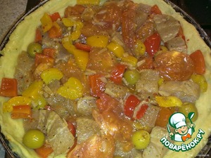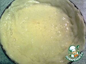 Выложить в форму, смазанную маслом и посыпанную панировочными сухарями, делая бортики по краю формы. Смазать поверхность яйцом (по желанию). Тогда нужно еще 1 яйцо (вернее, его половинка).