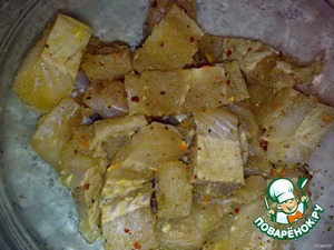 Нарезать рыбу небольшими кусочками. Добавить специи и посолить по вкусу