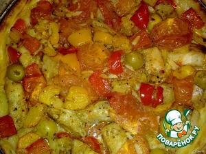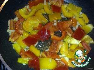 В небольшом количестве растительного масла обжарить перец, чеснок. Затем добавить помидоры, приправить, положить разрезанные пополам оливки.