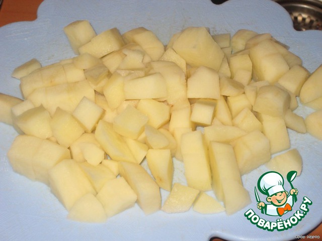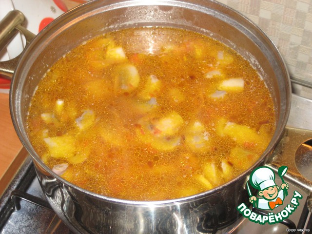 Когда грибы сварятся (минут 15 их проварить), добавить картофель, нарезанный кубиками.