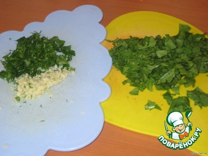 Щавель нарезать, петрушку, укроп и чеснок измельчить.