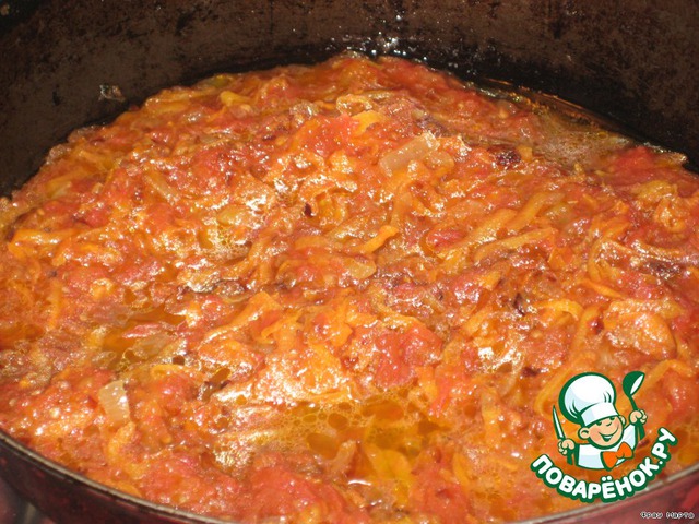 Обжарить на растительном масле лук, морковь до золотистого цвета, добавить томат, немного прокипятить - получается зажарка для борща.