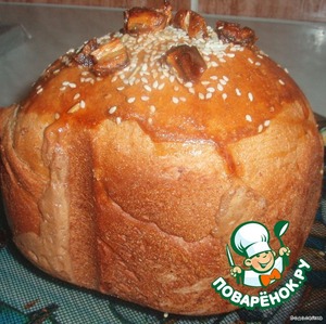 Где-то минут за 30-35 до конца выпечки открыть аккуратно крышку, смазать верх хлеба взбитым яйцом и посыпать сверху кунжутом и финиками. Хотя финиками можно и не посыпать.