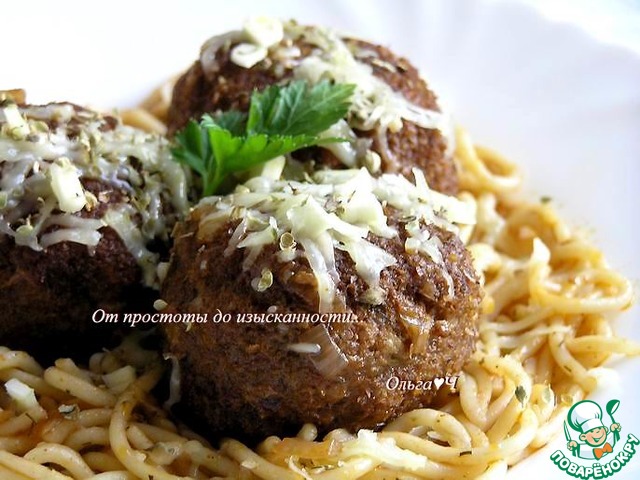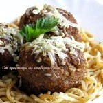 Идея этого блюда - из многоуважаемой итальянской кухни, однако сами мясные шарики готовлю по-своему рецепту - с изюмом и лесными орехами. Попробуйте - надеюсь, придется по вкусу!