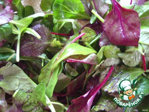 Листья салата, мяту, базилик промыть, обсушить, выложить на тарелки,