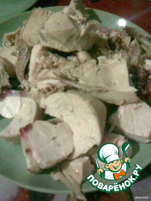 Курицу отварить в специях, охладить и рaзрезать на порционные куски (соли надо столько, чтоб мясо не досаливать дополнительно)