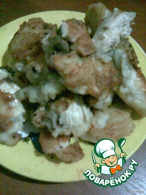 Вот такие румяные кусочки выходят. Не бойтеяь, что в состав кляра входит водка. Во-первых, ее совершенно не чувствуешь, а во-вторых, именно она придает хрустящие свойства.