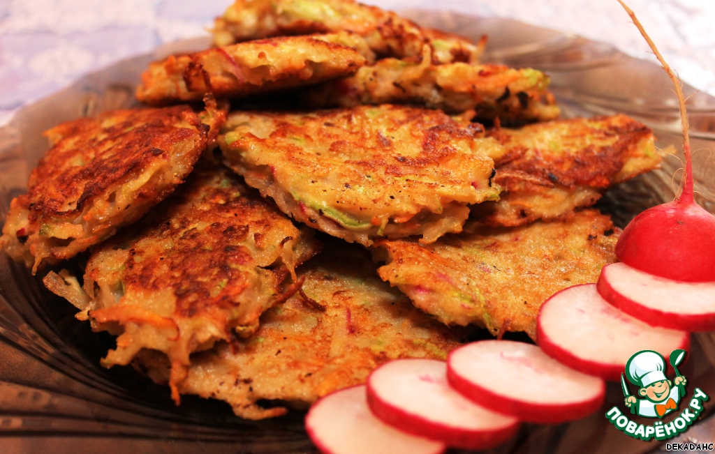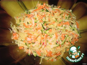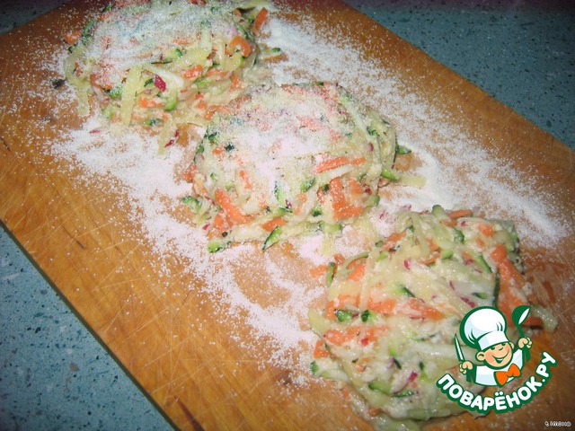 Все натираем на обычной терке, солим, перчим! Добавляем 3 ст.л. манки, остальная манка для панировки. Я добавила еще 1 яйцо. Перемешиваем.