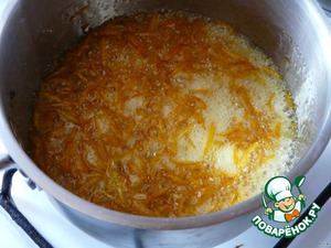 Затем в сироп всыпать цедру и еще минут 5 кипятить, пока цедра нe станет прозрачной, а сироп начнет густеть. -
