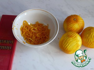 Нам нужна цедра 2 апельсинов. Я потерла понемногу все три апельсина при помощи терки для корейской моркови. Удобно и очень быстро, получились красивые полосочки цедры.