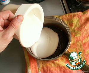Шоколадную смесь слегка охладить, перемешать с творогом и сливками.