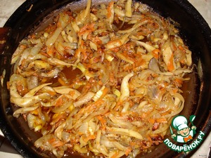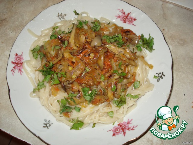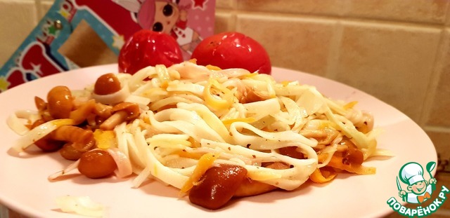 Пока варится лапша, нарезаем соломкой лук и грибы. На крупной терке трем морковь и обжариваем с луком и грибами до готовности. Добавляем грибную приправу и снимаем с огня.
