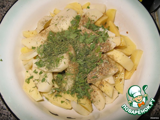 Добавляем к картошке любимые приправки. Я клала смесь для гриля, орегано, перец, кориандр молотый.