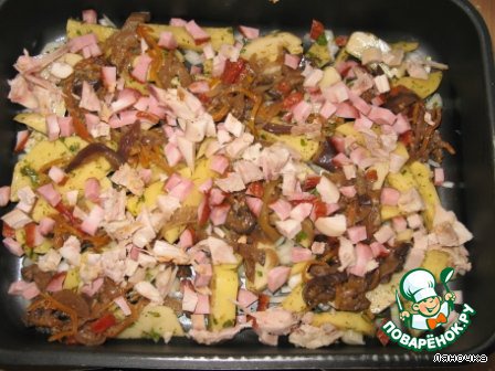 Кладем кусочки порезанной колбаски, курочки - все, что есть из готового к употреблению мяса... Много не кладите, нам нужно всего ничего, для запаха.